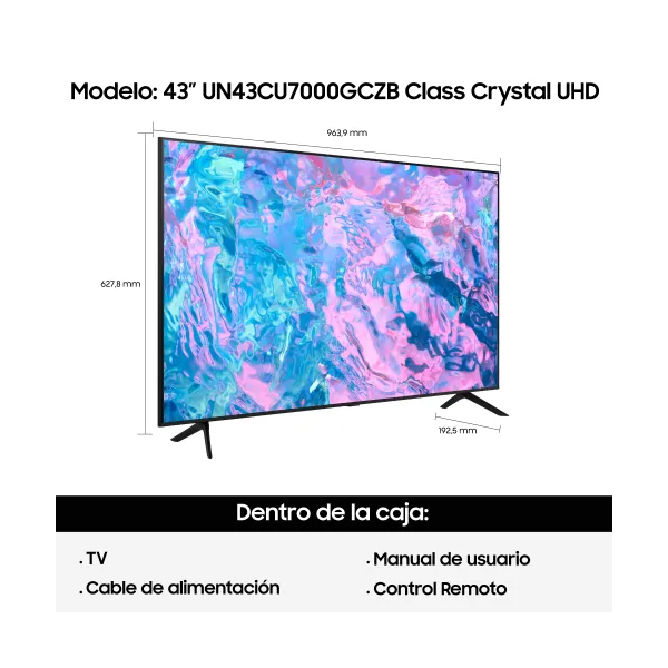 *Las funciones (formatos HDR, eARC, cantidad de puertos, patrón VESA y potencia de audio) pueden variar según la serie/modelo (p. ej., DU/CU, Serie 7) y la región. Para una ficha 100% precisa, verificá el código de modelo en la etiqueta del equipo.